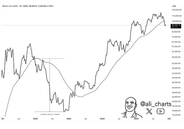 分析师指出,BTC有效跌破了50周均线(其实就是大致相当于年均线,因为50乘以7等于350接近于一年365天),上次有效跌破还是2022年,直接开启了熊市。