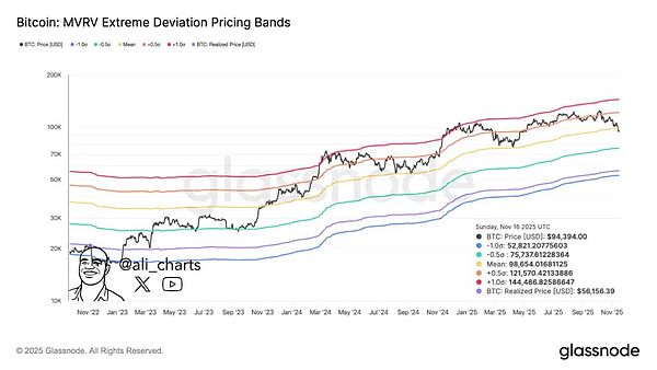 最后,分析师根据MVRV的几条标准差曲线指出,在均值$98,650下面的支撑位可能有:-0.5个标准差的$75,740;-1个标准差的52,820。